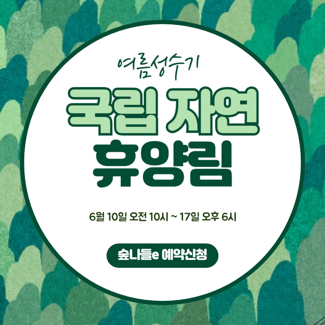 전국의 국립자연휴양림 여름성수기 추첨 신청기간은 6월 10일 오전 9시 ~ 17일 오후 6시까지입니다. 여름 성수기(7월 15일 ~ 8월 24일) 이용을 위한 추첨 신청기간 놓치지말고 신청하셔서 이번 여름에는 숲 속에서 시원한 휴가를 보내시기 바랍니다.