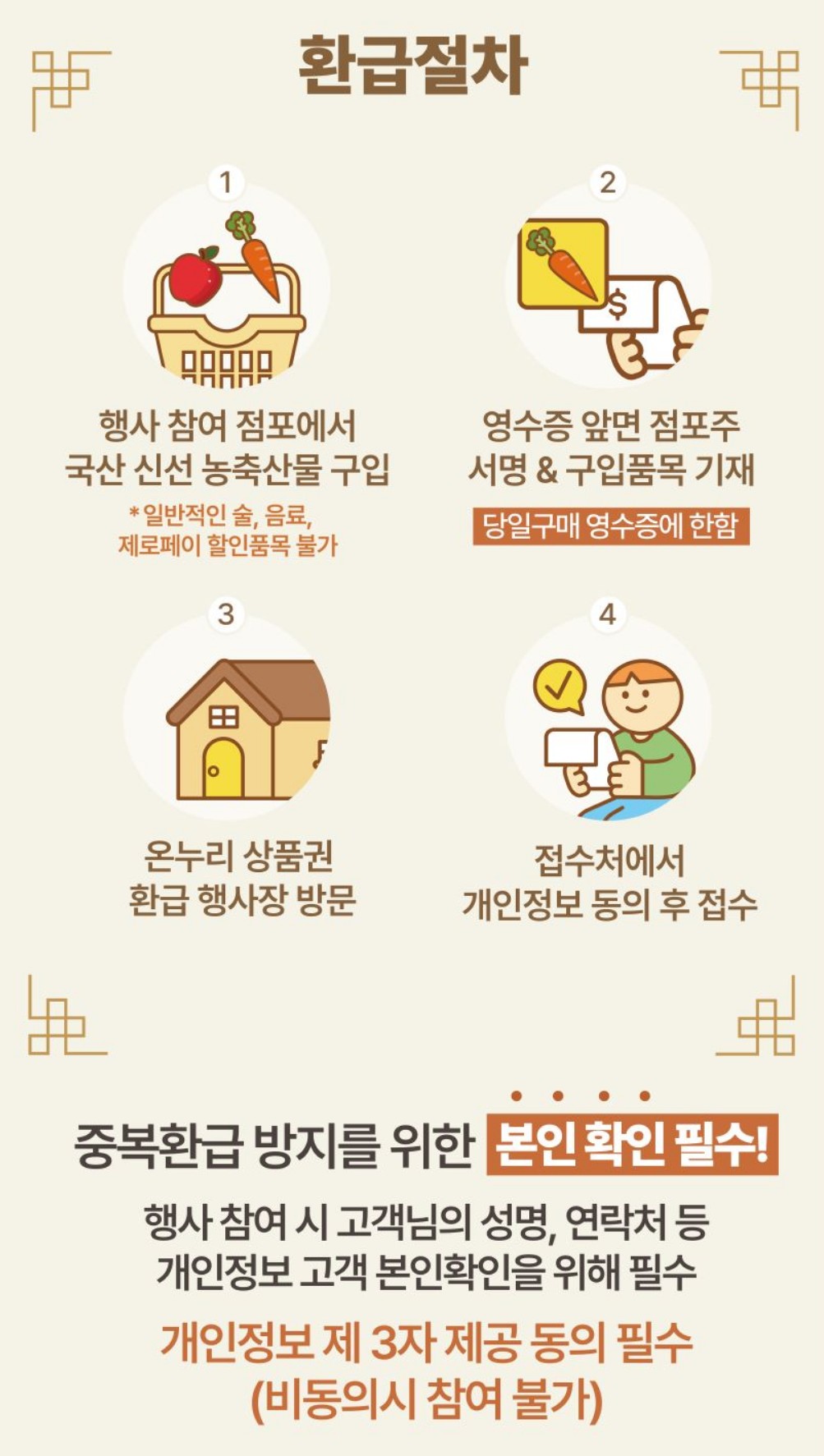소비자가 영수증과 신분증 지참 후, 시장 내 환급부스 방문, 본인확인 후 온누리상품권으로 환급