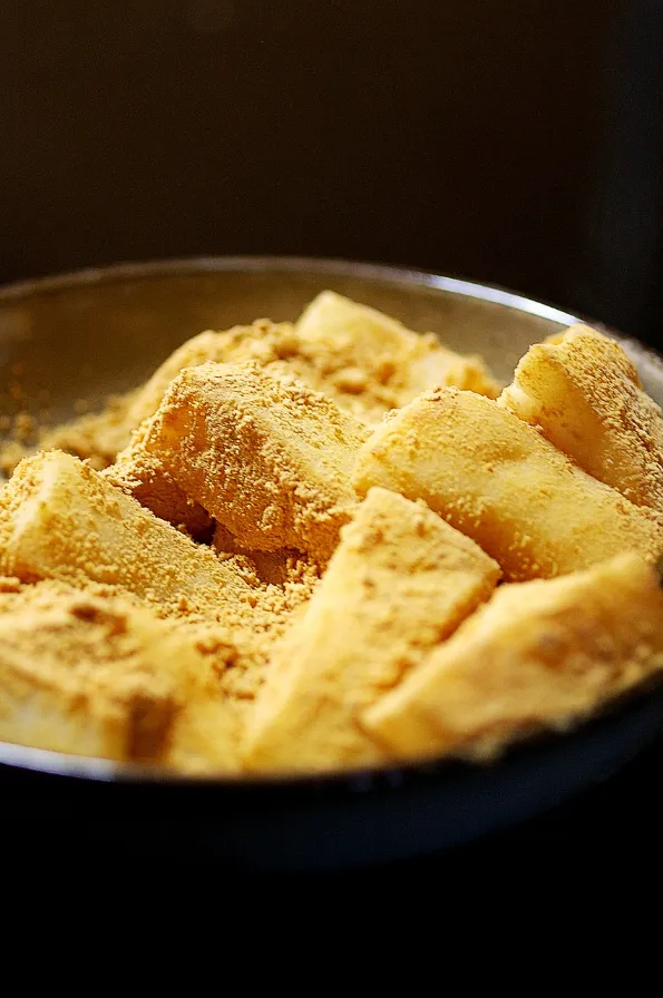 1624년, 인조임금 때 이괄이 반란을 일으켜 당시의 서울인 한양을 침공했습니다. 왕은 하는 수 없이 공주로 몽진하였습니다. 왕이 공산성에 올라 멀리 북쪽에 두고 온 한양을 근심스럽게 바라보곤 하였습니다. 인근의 부호인 임 씨 집에서 한 광주리에 음식을 푸짐하게 담아 왕께 진상하였습니다. 조심스럽게 덮은 보자기를 걷어내니 콩고물에 무친 떡이 가득하였습니다. 인조가 떡의 이름을 물었으나 아무도 대답하지 못했습니다. 그러자 임금은 이 떡을 어느 집에서 만들어왔느냐고 물었고, 사람들은 근치 임 씨 집에서 만들었다고 했습니다. 그 말을 듣고 왕은 임 씨, 가장 맛있는 떡 절미, 임절미라 하는 게 어떻겠냐고 물었습니다. 그리하여 이때부터 이 떡을 '임절미'라 부르게 되었고, 나중에 임의 'ㅁ'이 'ㄴ'으로 바뀌어 인절미라고 부르게 되었다고 합니다.
