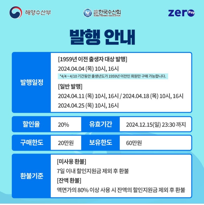 '2024 대한민국 수산대전'이 4월 4일부터 4월 21일까지 운영됩니다. 4월에는 제로페이 모바일 상품권 앱에서 국내산 수산물 전용 제로페이 상품권을 구매시 20% 선할인된 금액으로 구매할 수 있습니다. (*1인당 한도 : 4만원)